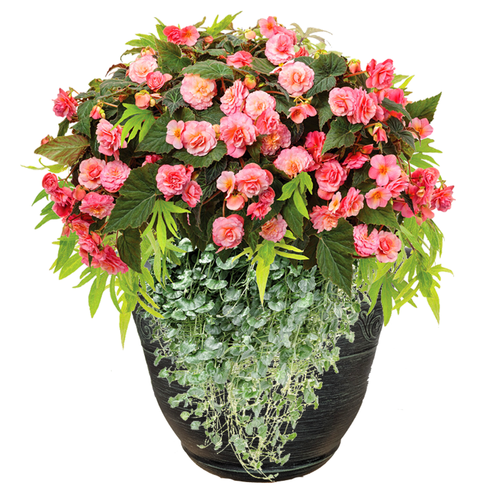 Set the mood for entertaining, relaxing, and enjoying the outdoors with this part sun to shade loving combination planter which includes three color varieties of Dichondria (silver green), Ipomea (lime-green) & Begonias (pink). Whether it’s a patio, porch, balcony, poolside, or fire-pit seating area, these planters make decorating your outdoor spaces a breeze.