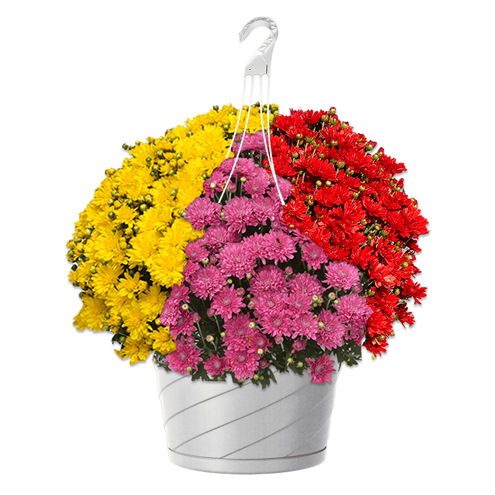 Get festive for fall with this combo hanging basket mum in the color pink, yellow and red. Whether it’s a patio, porch, balcony, or fire-pit seating area, these containers make decorating your outdoor spaces a breeze.