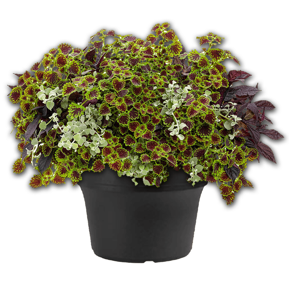 Set the mood for entertaining, relaxing, and enjoying the outdoors with this sun to shade loving foliage combination planter which includes three color varieties of Coleus (green-red bicolor), Ipomea (dark purple) & Helichrysum (silver green). Whether it’s a patio, porch, balcony, poolside, or fire-pit seating area, these planters make decorating your outdoor spaces a breeze.
