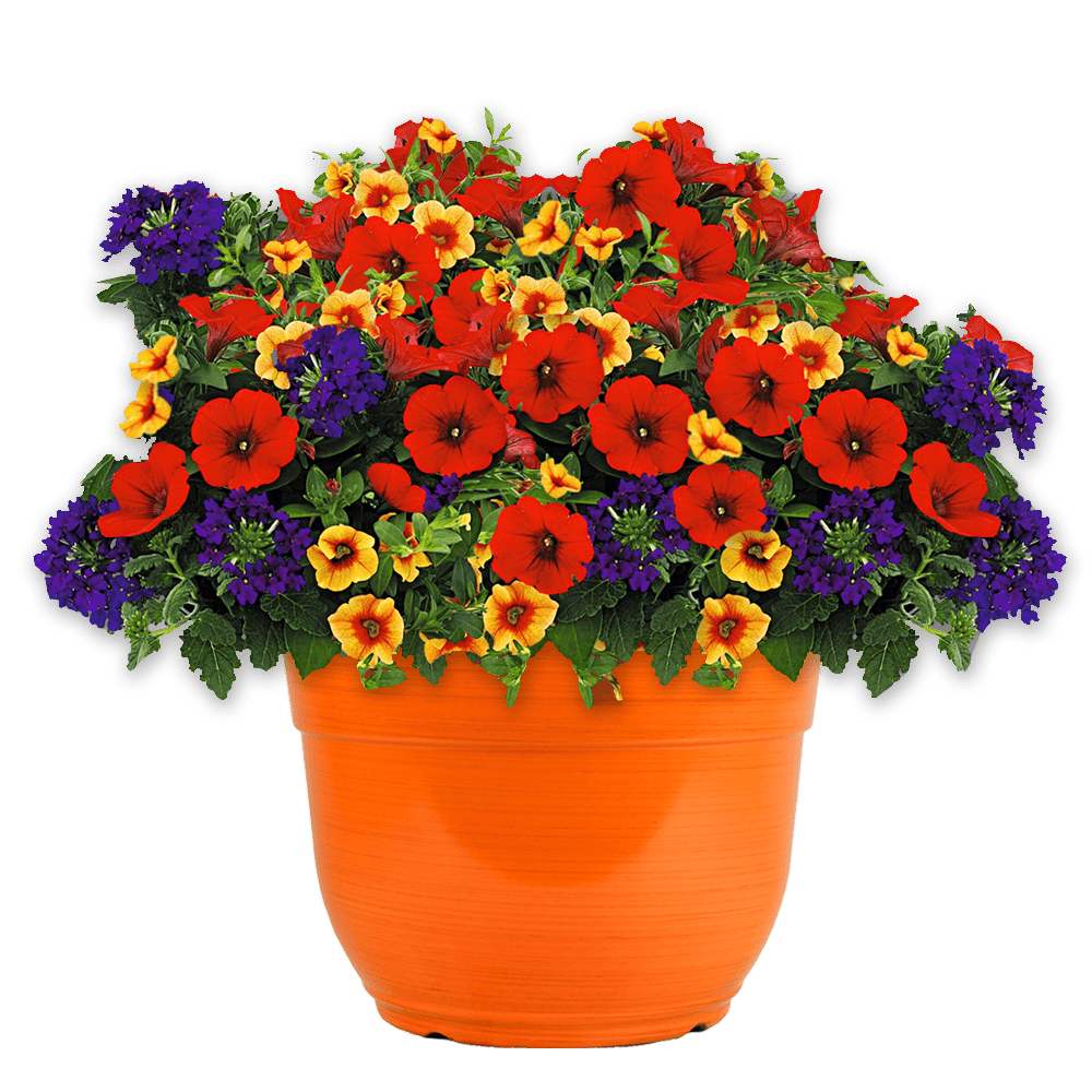 Set the mood for entertaining, relaxing, and enjoying the outdoors with this sun loving combination planter which includes three color varieties of Verbena (purple), Calibrachoa (yellow & orange bicolor) & Petunia (red). Whether it’s a patio, porch, balcony, poolside, or fire-pit seating area, these planters make decorating your outdoor spaces a breeze.