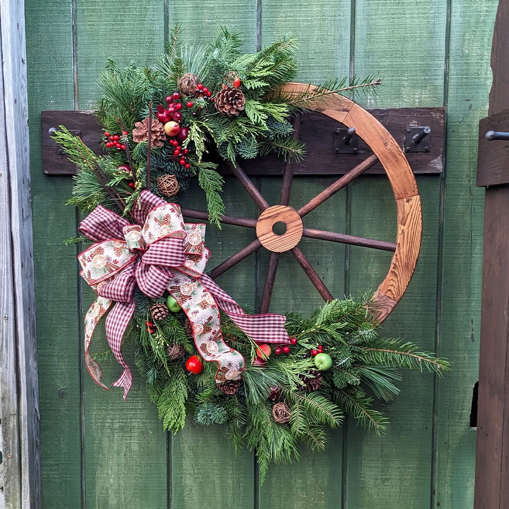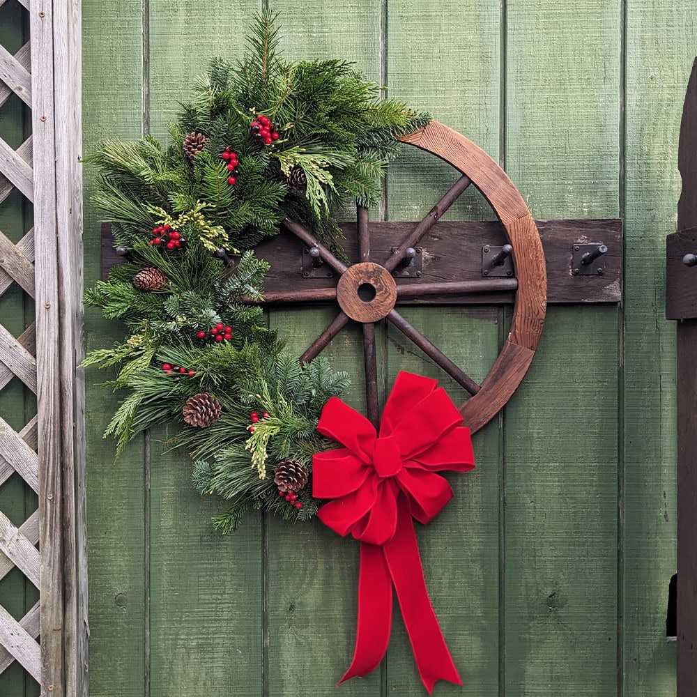 This isn’t your typical wreath—this is a massive rustic statement piece you’ll be proud to call your own. Using a 24″ wagon wheel as your base, you’ll create a one-of-a-kind holiday masterpiece bursting with fresh evergreens, berries, pinecones, and a gorgeous bow. Your friends and neighbors will double-take—because you simply cannot buy this in stores.